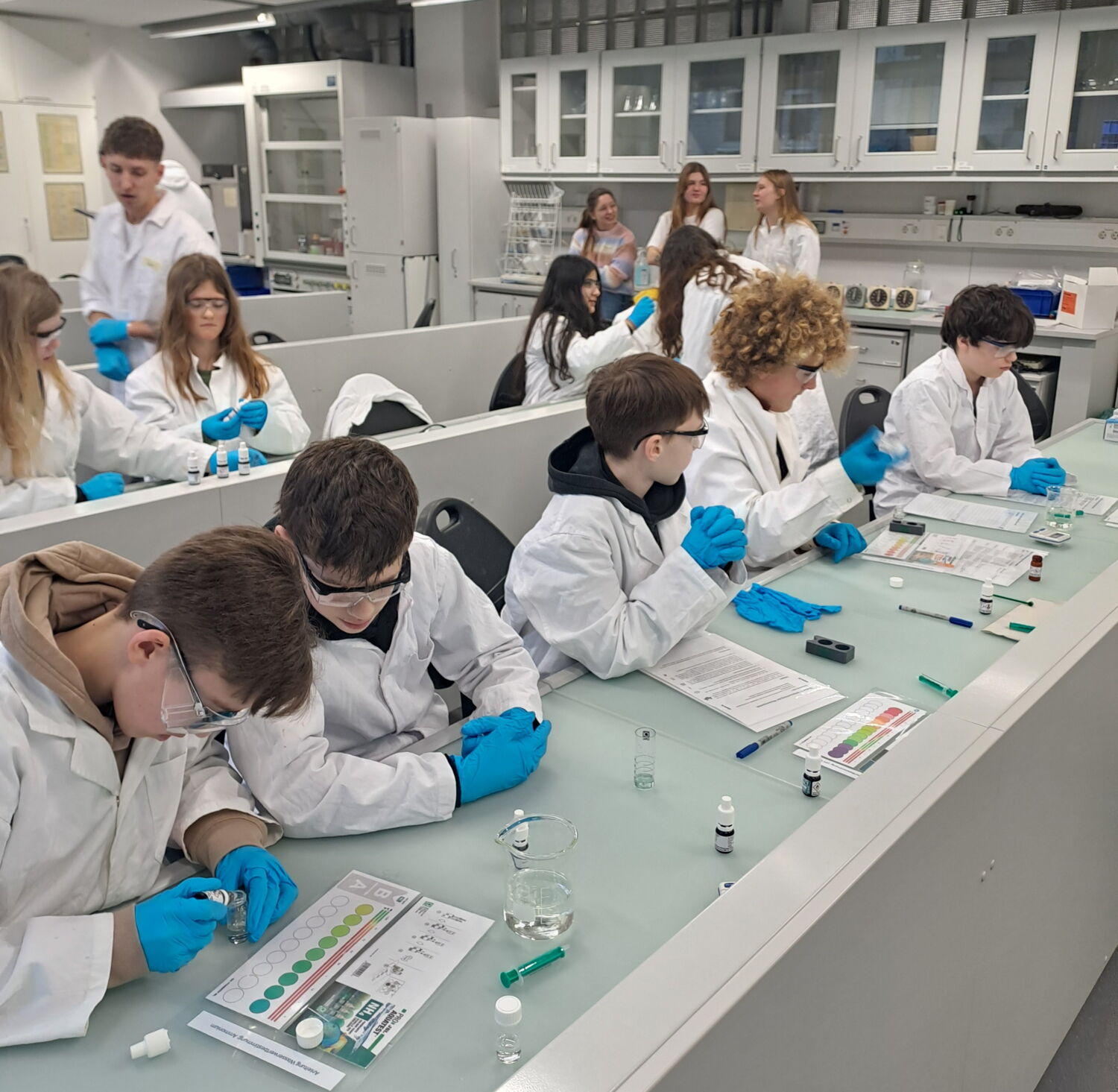 Ein weiterer Schwerpunkt lag auf der praktischen Anwendung. Die Schülerinnen und Schüler beobachteten eine reale Anlage, führten kleine Experimente zum Nachweis von Nähr- und Inhaltsstoffen durch und stellten Fragen zu Pflege, Wartung und Steuerung der Systeme. Abschließend wurden die Vor- und Nachteile der Aquaponik gemeinsam diskutiert – von Ressourceneffizienz und Umweltfreundlichkeit bis hin zu technischem Aufwand und Kosten.
