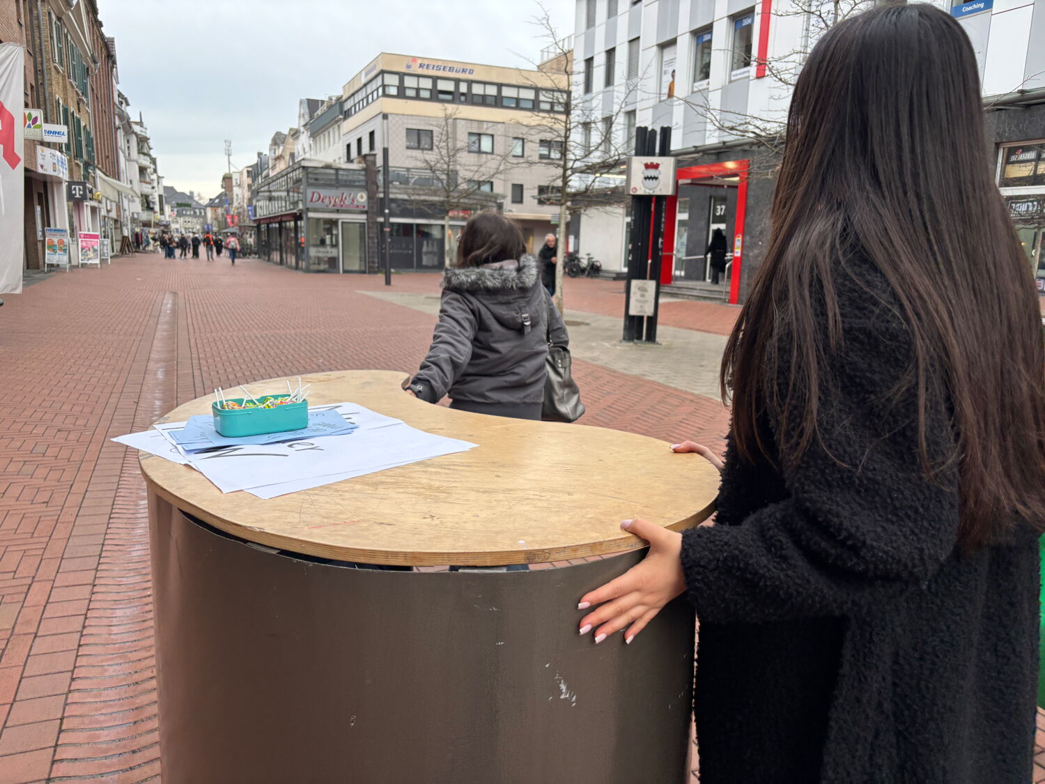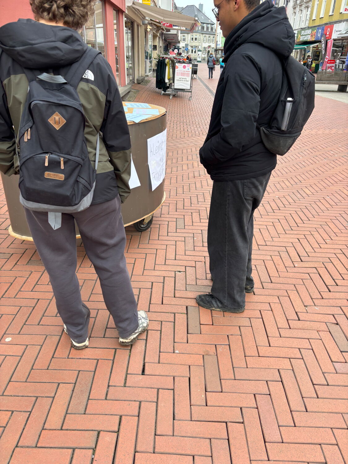 Am Dienstag um 11:15 Uhr trafen wir uns im Foyer, nahmen einen Tisch und Stühle mit und machten uns gemeinsam auf den Weg in die Fußgängerzone. Dort stellten wir uns an einen gut gefüllten Ort und luden Passantinnen und Passanten dazu ein, an unserem Quiz teilzunehmen. Viele Menschen verschiedenen Alters blieben stehen und zeigten ihr Interesse an unserem Projekt. Wir erhielten viel Zuspruch und Anerkennung für unser Engagement und viele betonten, wie wichtig solche Aktionen für unsere Gesellschaft sind.