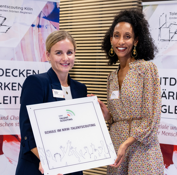 Am 10.09.2025 wurde unserer Schule im Rahmen eines feierlichen Festaktes an der Universität zu Köln die Plakette „Schule im NRW-Talentscouting“ verliehen. Stellvertretend für unsere Schulgemeinschaft nahm Frau Vollmer diese besondere Auszeichnung entgegen.