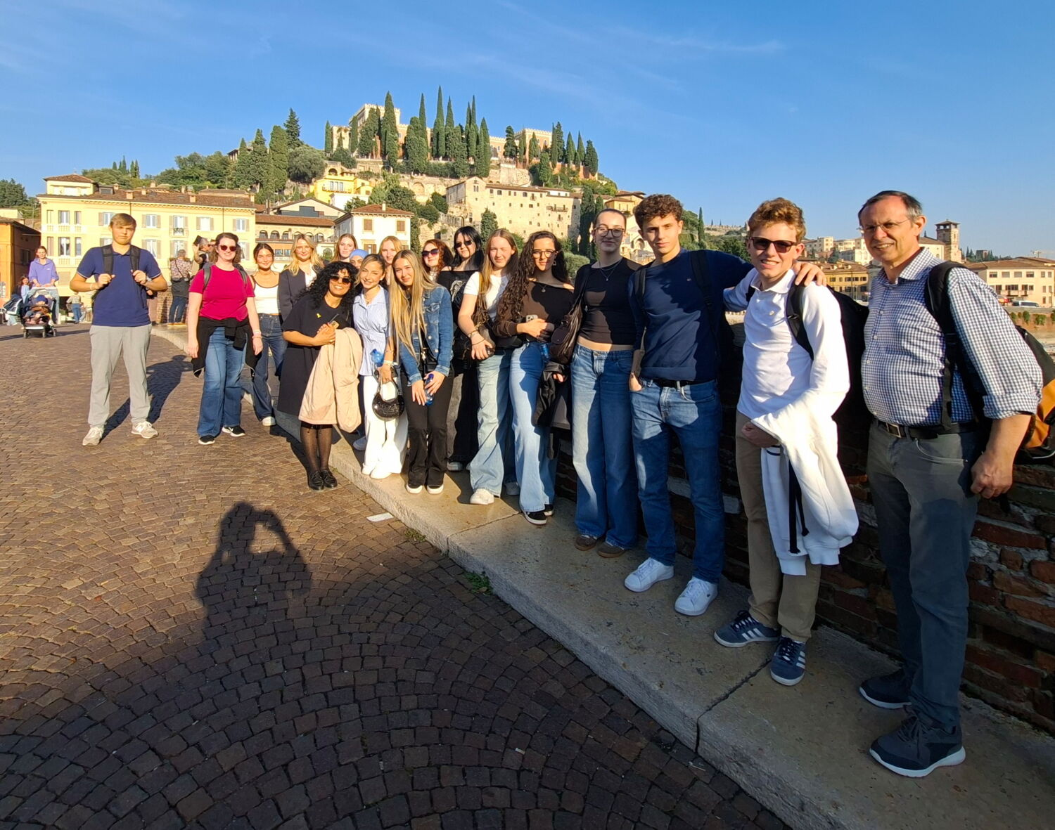 Besuch vom Gardasee: Da zeitgleich eine Kursfahrt unserer Schule einen Ausflug nach Verona machte, erklärten sich Schüler des Liceo Messedaglia zu einer Führung von Schülern für Schüler bereit. Rechts ist eine Gruppe auf der Ponte Pietra zu sehen und im Hintergrund (sehr klein) die andere Gruppe auf dem Castel San Pietro.