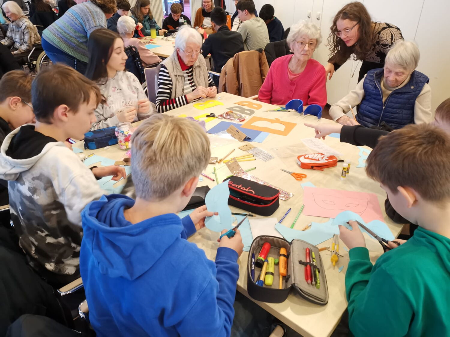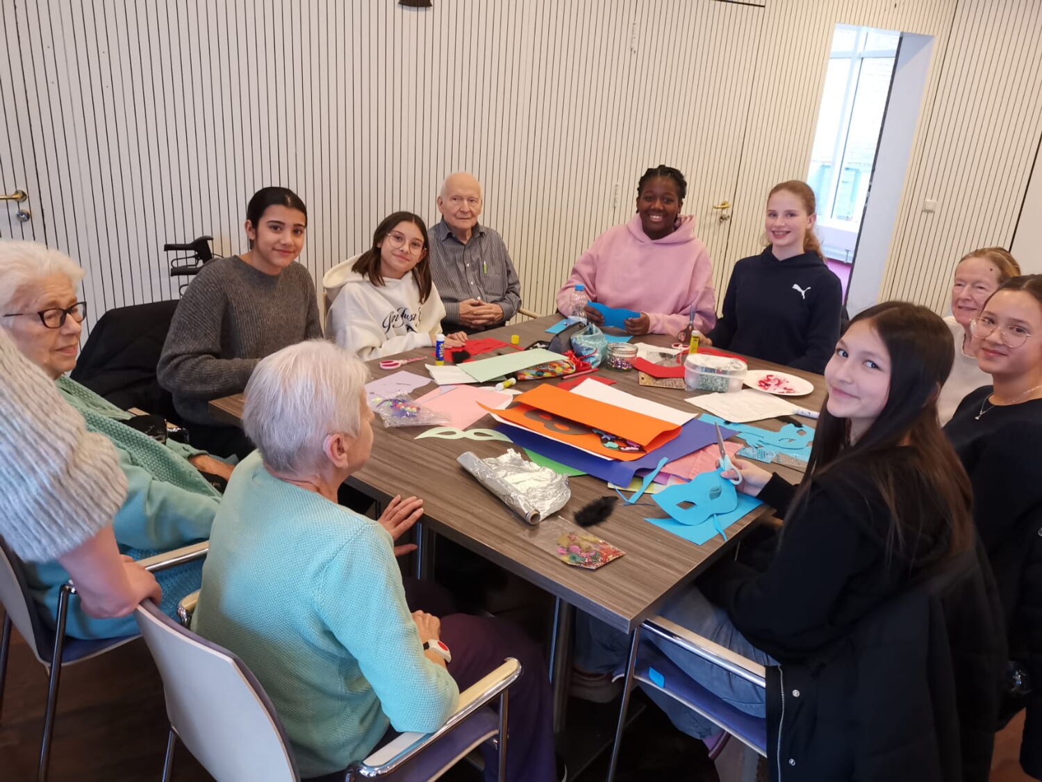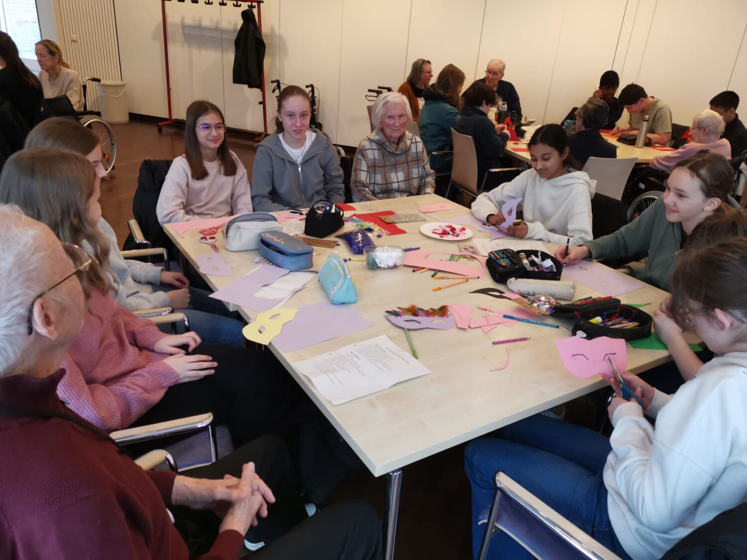 „Heute waren wir, die beiden Religionskurse der siebten Stufe, im Seniorenheim Haus Upladin in Opladen. Dort haben wir mit den Bewohner*innen Karnevalsmasken gebastelt. Zu Beginn hat uns Frau Schäfer, die Sozialpädagogin des Hauses, im Empfangsbereich freundlich begrüßt. Danach bildeten wir Gruppentische und luden die Bewohner*innen ein, zu uns an die Tische zu kommen.
